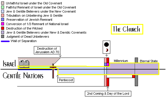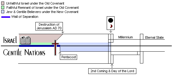 The writer of Hebrews wrote that the Old Covenant was made ‘obsolete’ by the New Covenant, and that it was in the process of passing away, [Heb. 8:13]. This was written shortly before AD70. So we have an overlapping of the Old Covenant and the New Covenant for one generation. Gentile believers are also included in the New Covenant, represented by the light blue section below the center line.