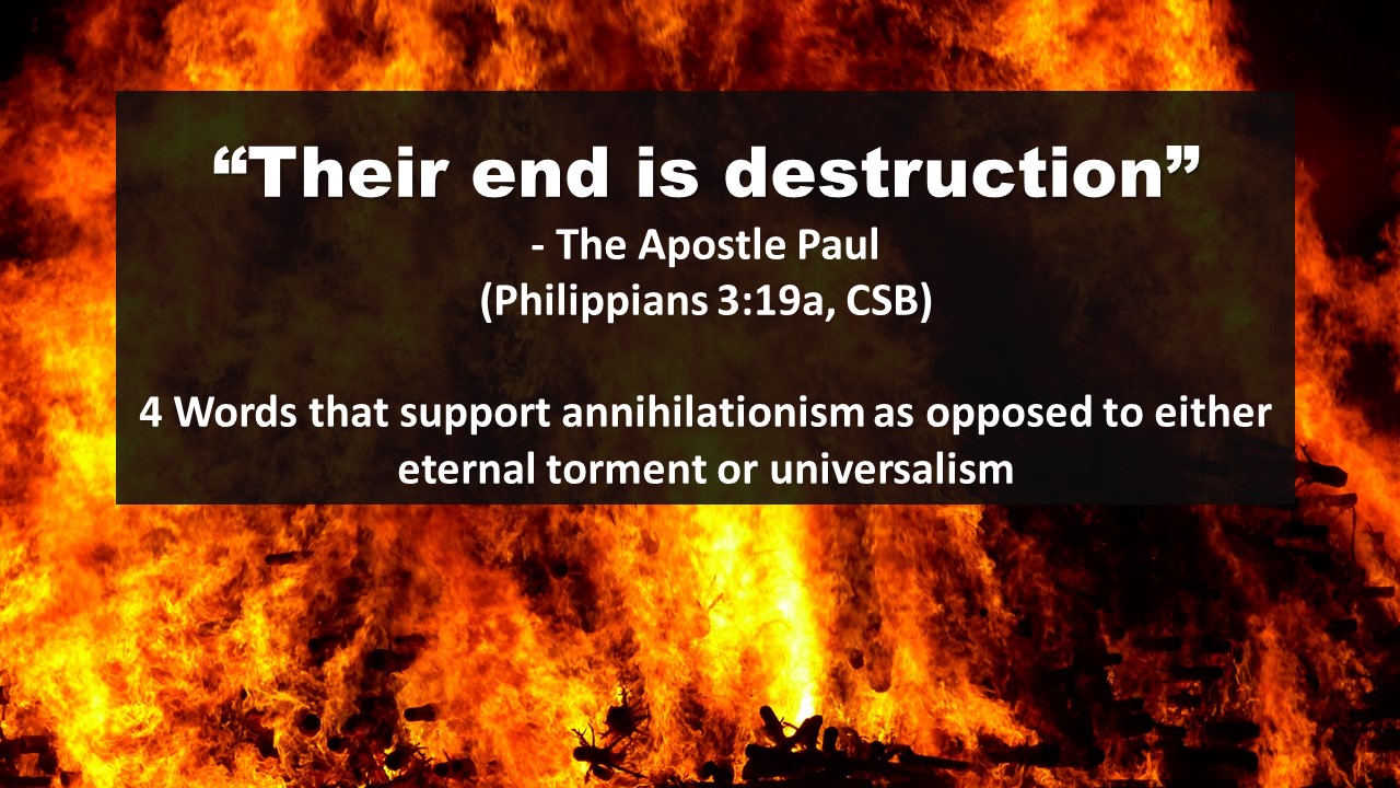 Having now seen more than a dozen different ways the Old Testament says that wicked people will eventually be destroyed and cease to exist, we will see that the New Testament continues the same idea, saying that the wicked are totally consumed and become non-existent.