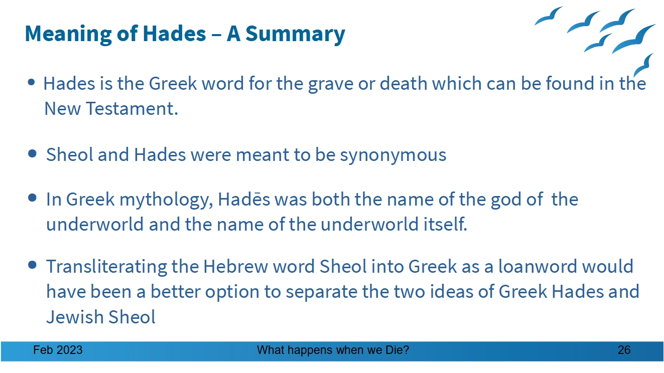 It is also possible that they used Hadēs because they did not have a Greek word that had the same meaning as Sheol. The Greeks believed that the human soul was immortal, and so they did not have a vocabulary word that was the equivalent of Sheol which meant “the state of being dead.”
